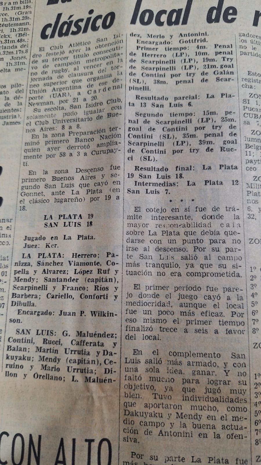 Ese año La Plata se consagró ganador de la zona Descenso en Intermedia con 12 triunfos, un empate y una sola derrota. Pero en cuartos de final se cruzaron con los mejores y CASI ganó 32-9 en cuartos de final.