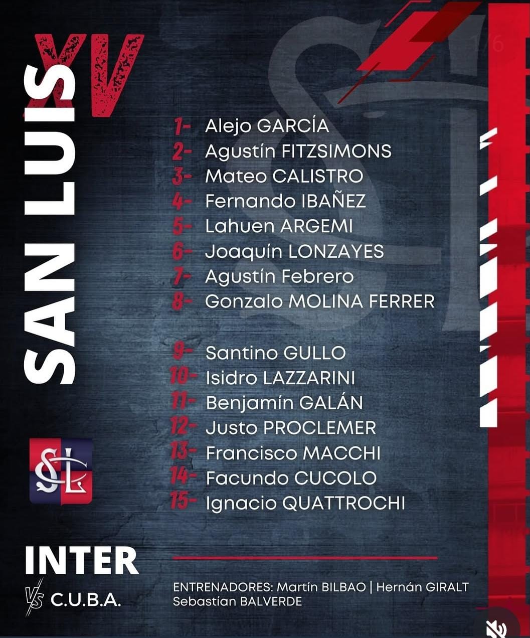 Al mismo tiempo que por el torneo de Primera A Universitario, -que la fecha pasada ganó su primer encuentro y sumó en las últimas cuatro jornadas- tendrá una visita más que riesgosa: a Los Matreros, uno de los principales candidatos a ascender. Desde las 15:30 Ramiro Pacheco y Eduardo Ramos Alvelo eligieron a 1- Gerónimo Lagana, 2- Manuel Urban, 3- Ciro Scaglia; 4- B. Damioli, 5- Bautista Herrera; 6- Sebastián Portunato, 7- Olivero, 8- Fabio Urréjola; 9- Blas Rivera Cano, 10- Patricio Cachaza, 11- Mateo Cecchi, 12- Lorenzo D’Onofrio (c), 13- Fernando Fernández, 14- Alejo Vergel 15- Franco Suárez.